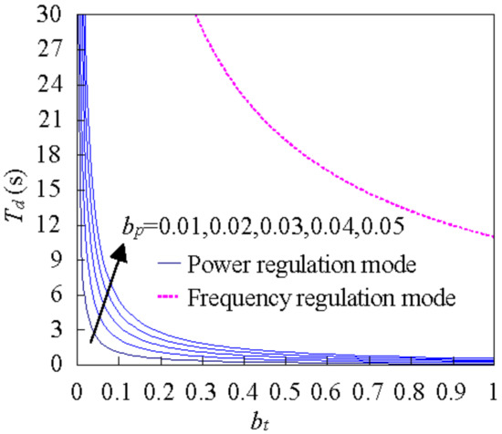 In [72], Guo et al. studied the hydraulic-mechanical-electrical coupling CSSA for surge tanks under the operating conditions of primary frequency regulation. The obtained analytic formulas of CSSA for surge tanks under primary frequency regulation are shown in Equations (9) and (10). The CSSA for surge tanks under primary frequency regulation makes the system reach the critical stable state, and is an important basis for the design of surge tanks. Taking a hydropower station as an example, the values of and are calculated from Equations (9) and (10) and shown in Figure 3. For the value, distribution and change law, there is a great difference between and . Equations (9) and (10) contain the parameters of and . In practical applications for primary frequency regulation, the CSSA for surge tanks and governor parameters can be tuned and optimized together based on Equations (9) and (10):