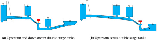 In order to reduce the sectional area of the surge tank, the water pressure of pipelines is introduced into the turbine regulating system as a part of the input signal [69]. By considering the water pressure feedback, a model of a turbine regulation system is established. The frequency-domain characteristics of the turbine regulation system are analyzed based on the inverse frequency characteristic method. The analysis results show that the introduction of water pressure feedback can decrease the value of CSSA for surge tanks. In [70], Wang et al. studied the effect of connecting pipes on CSSA for surge tanks. If the connecting pipes of surge tanks are long, the flow inertia of the connecting pipes is great. Based on theoretical derivation, numerical calculation, and project case, it is proved that the flow inertia of connecting pipes is favorable for the stability of water level oscillations in surge tanks.