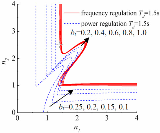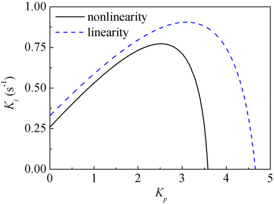 In [79,80], Guo et al. investigated the dynamic behaviors of turbine regulation systems with air cushion surge tanks based on both linear and nonlinear complete mathematical models. The linear stability of turbine regulating systems with air cushion surge tanks is analyzed based on transfer function theory. The Thoma assumptions are broken through. By using stable domain, the effects of system parameters, regulation modes of the governor on stability are illuminated (Figure 6). Based on direct numerical integration and Hopf bifurcation theory, the nonlinear dynamic response of turbine regulation systems is described and analyzed (Figure 7).