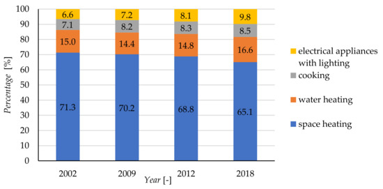 In Polish residential buildings most of the energy (65.1%) is still used for space heating [9], despite a downward trend (similar to that seen in the rest of Europe) resulting from the improvement in the quality of their thermal properties through the adoption of increasingly stringent energy regulations. The change in the structure of energy consumption for households in Poland in recent years is shown in Figure 1. In European Union countries, heating and ventilation account for 57% of total energy consumption, 25% for hot water preparation, 7% for cooking and the remaining 11% is related to lighting and the use of household appliances [10].
