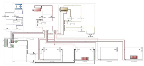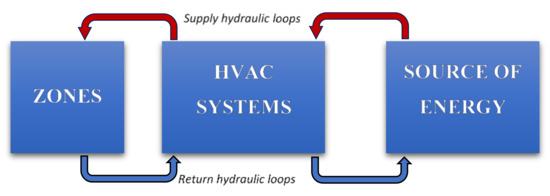 DesignBuilder software version 6.1.5.004 was used to perform the simulations. This program is based on a powerful calculation engine EnergyPlus and in practice is an advanced graphical interface. The algorithm of this software applies a number of blocks used for balancing energy and mass. These modules are connected by hydraulic and airflow loops. A simplified diagram of the software structure is presented in Figure 2.