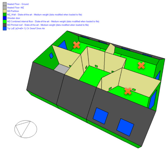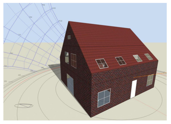 Heat transfer coefficients of the building partitions are the following: external walls—0.20 W/(m2K); pitched roof—0.149 W/(m2K); ground floor—0.232 W/(m2K); ceiling under the attic—0.145 W/(m2K); window—0.982 W/(m2K). The main parameters of the windows are: solar heat gain coefficient—0.474; visible radiation transmittance factor—0.661; shading implemented with blinds with slats with an average reflection coefficient; painted wooden frames.