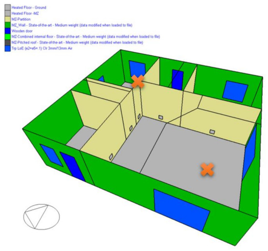 The building model, shown in Figure 3, was divided into ten isothermal zones as listed in Table 1. Seven zones are heated, two rooms and the attic are unheated, five zones have a supply-exhaust ventilation system, and two zones have exhaust fans. Figure 4 and Figure 5 show 3D views of both floors. Rooms with mechanical ventilation are marked with a red cross. The central heating system consists of floor heating and panel radiators. An electric heater is also provided in the bathroom. It allows a quick increase in air temperature and turns on when the floor heater does not provide the operating temperature. The supply-exhaust ventilation system is equipped with a heat recovery using a cross-flow exchanger. The gas condensing boiler is a heat source in the basic variant. Domestic hot water is heated by this boiler. A diagram of the whole heating and ventilation system is presented in Figure 6.
