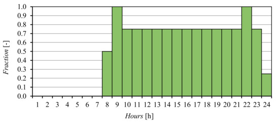 The simulation of the heating and ventilation system and the building’s energy balance, including heat gains, were implemented using appropriate schedules. The calculations included a number of daily, weekly and annual timetables regarding occupancy of the building by residents, lighting operation, operation of electrical equipment, control method of indoor air temperature, operation of the supply and exhaust ventilation system and the demand for domestic hot water. As an example, two schedules prepared as shares (fractions) of maximum values are presented in the form of charts. Figure 7 shows the frequency of common areas/rooms occupancy by residents, and Figure 8 presents the same schedule in self-insulation conditions. Figure 9 and Figure 10 show the frequency of using the shower and sinks in the bathroom under typical and self-insulation conditions. Developing schedules accurately ensures a real reflection of the residents’ behavior in the building, which increases the reliability of numerical simulations.