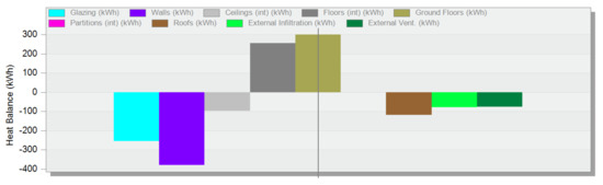 The first step was to calculate the building’s energy consumption in various variants using the DesignBuilder software. An example of the result for March is presented in Figure 11 as a screenshot of this software. The positive energy balance values shown in the diagram resulted from the operation of the underfloor heating system.