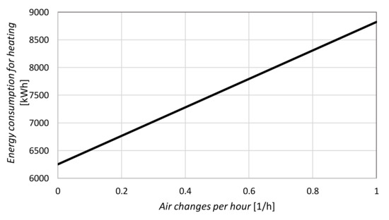 The correlation between the energy consumption for heating of the building and the amount of ventilation air changes is shown in Figure 12.