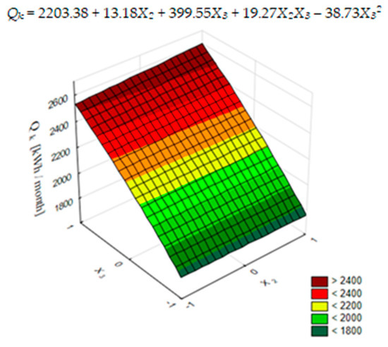 The regression equation describes the results of calculations adequately if the value of F is much greater than the tabular value Ft at the level of significance p and degrees of freedom f1 and f2. Calculations show that for model (Equation (4)) value F = 735,105.0974/3606.1669 = 203.8467. Tabular value Ft = F0.05;23.9 = 2.91 [32]. So, the value of FI exceed Ft many times, which means that the model is adequate. Its high quality is also confirmed by the coefficient of determination at the level of R2 = 0.9981. The significance of coefficients in Equation (4) was also checked. Testing was performed using the t-criterion. Because, at each point of the plan, there is one result without repeats, the approach described by Hartmann at al. [32] was used. According to it, for each coefficient tj = |bj|/Sbj, was calculated, where bj—values of coefficients of the regression equation; Sbj—standard deviation of the j-th coefficient. To determine Sbj, the residual variance Sr2 was used based on the sum of squared deviations . The values were compared with the critical value t0.05;9 = 1.83 [32]. If tj < t0.05;9 the coefficient was considered irrelevant. After testing and analyzing the results, the model was considered useful for further analysis. The effects of selected factors on the Qk for the assumed conditions were analyzed. The impact of pandemic factors on changing the structure of the consumed energy was also examined. Electricity demand Eel for the operation of various types of electrical equipment and energy from fuels (gas) for heating rooms and domestic water preparation Qg were considered. Changes in Eel and Qg values were analyzed depending on the length of the X2 self-isolation period and the number of residents in the X3 house in March.
