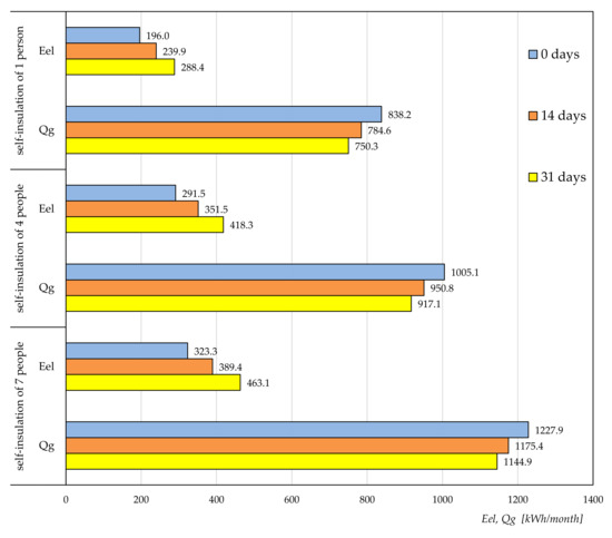 - It can also be said that during periods of residents’ self-isolation, there are changes in the structure of building energy demand. With the increase in the length of the self-isolation period from 0 to 31 days, the demand for electricity for the operation of various types of electrical equipment Eel increases by about 40–42%, while the demand for energy contained in the fuel burned Qg decreases by about 7–10% for each number of residents remaining in self-isolation.