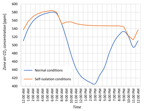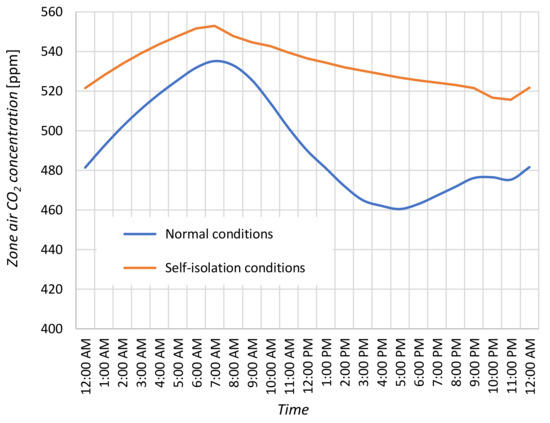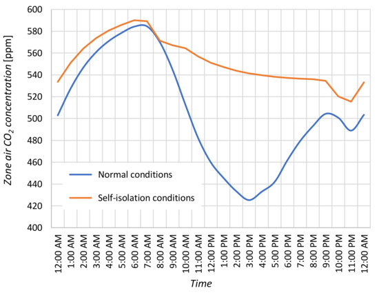 - The article also analyses whether the self-isolation of residents can affect the quality of indoor air. As shown by the simulation results, the IAQ remained at a similar level, within the recommended range. It was the result of using mechanical ventilation and changing the air flow rate VV as a function of the number of inhabitants and the schedule of their stay at home. The increase in the number of inhabitants from one to four and to seven required a triple and fivefold increase in the value of VV, respectively. The only negative consequence of the operation of ventilation system was too low moisture content in the indoor air.