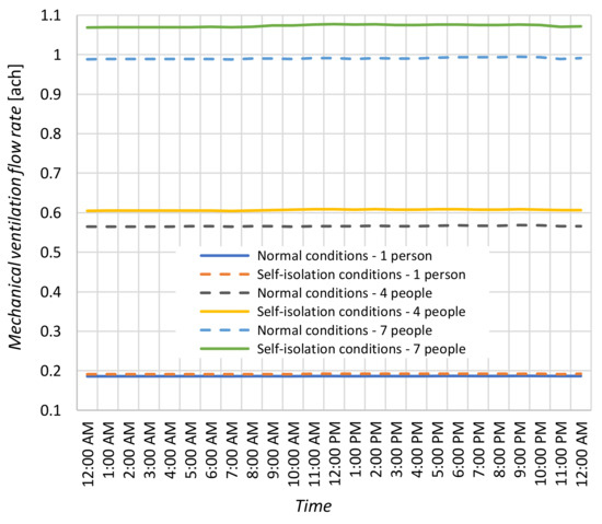 The next three figures (Figure 15, Figure 16 and Figure 17) compare the change in CO2 concentration for the presence of 1, 4 and 7 people in the building during one day in the middle of the week. Two variants were analyzed, i.e., the traditional way of using the rooms and the conditions of self-isolation of the residents. As it turned out, the acceptable level of CO2 concentration was not exceeded in all cases. Its maximum value was less than 600 ppm. We can only notice differences in the fluctuations of this concentration during the day. As could be expected, there is a significant drop in the CO2 share in the air in the period when people left the house. In the case of the self-isolated variant, only slight changes related to the movement of people inside the house can be observed. A relatively low concentration of CO2, even with the largest number of people, was ensured by mechanical ventilation. The ventilation air flow rate VV is shown in Figure 18 for all cases. When there was one person in the building, the VV value did not exceed 0.2 ach (Table 6). The increase in the number of people to 4 resulted in a threefold increase in the amount of air flow rate. However, in the case of 7 people, this increase was over five times. Comparing the differences between the standard conditions and the period of self-isolation, the increase in the value of the ventilation air flow was: in the case of 1 person—less than 3%, 4 people—about 7%, and 7 people—about 8%.