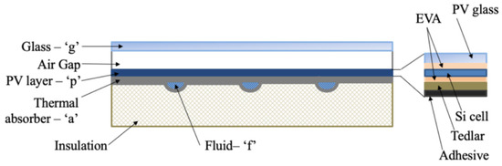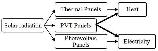 A PVT panel combines the benefits of a solar thermal (ST) and a photovoltaic (PV) panel in a single piece of equipment (Figure 1). It simultaneously produces heat and electricity, saving roof space, installation/transportation, and maintenance costs [1]. A system of PVT panels can be classified as a micro-cogeneration system. As in any cogeneration system, there is a tight relationship between the electrical and thermal energy production.