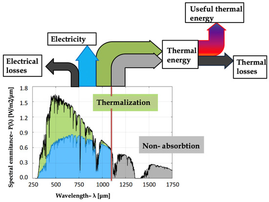 There are some significant advantages of a PVT panel over the stand-alone photovoltaic (PV) panels. First, substantial heat losses occur in a PV panel. The flux of energy in a PVT panel is shown in Figure 2. The losses occur through the thermalization (shown in green) of photons that carry a higher energy than the bandgap of the semiconductor material (shown as the red line), and through non-absorption of the photons that do not carry enough energy, respectively (shown in grey) [2]. Additional electrical losses occur, which cannot be recovered. However, by recovering the thermal losses, the overall solar energy conversion efficiency is improved, and useful thermal energy is produced, that can be utilized for various applications, e.g., heating, cooling, and domestic hot water.