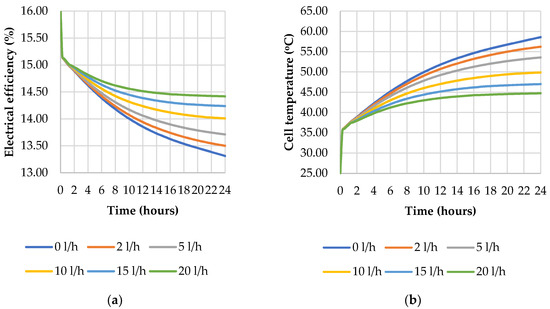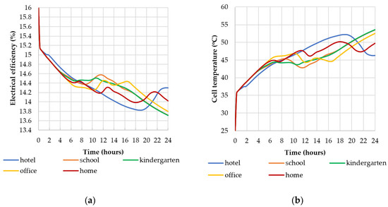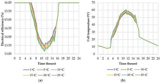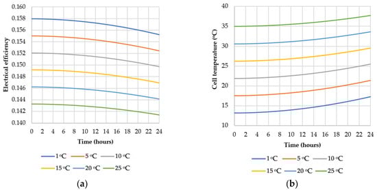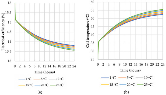 Daily variation (a) of electrical efficiency; (b) of cell temperature.