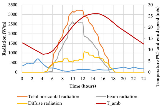 As a comparison and in order to ensure the theoretical constant parameter simulation would also work for actual meteorological conditions, the same simulation was run for a typical summer day in Bucharest, Romania. In this case, the solar radiation and temperature were no longer constant according to Table 1, but varied according to Figure 8. The results are shown in Figure 9. It can be observed that the same proportional difference as in the OFAT analysis is kept between the steps, but the efficiency drops even lower to 15.7% with a cell temperature of 60 °C due to temperatures and radiation being higher that the STC at midday. The peak occurs at maximum radiation around noon, with an additional spike around 16 due to the peak ambient temperature. The rest of the simulation results are run for constant STC conditions.