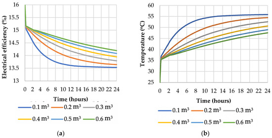 The variation of the (a) electrical efficiency; (b) cell temperature; as a function of the tank volume.