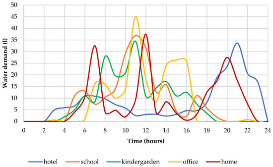 For the parametric study on the demand curve, an average total water draw of 200 L was considered for the daily usage, varying only the daily curve distribution according to the source data. In the case of larger users, such as hotels or office buildings, this is an assumption that scales down the size of the user to an equivalent home. The demand curves are illustrated in Figure 12 for a typical weekday (Monday–Friday, scaled down from the data to reach an area under each curve of 200 L/day).