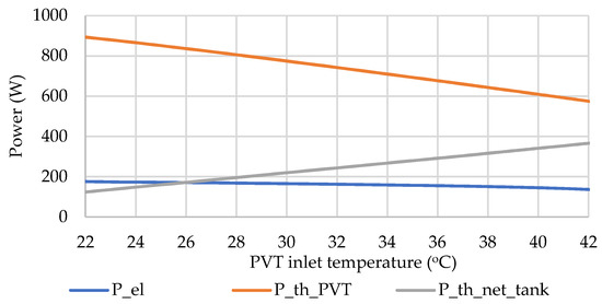 An interesting aspect to observe is the variation of the instantaneous power as a function of the temperature of the coolant at the inlet of the PVT panel, shown in Figure 14. This was carried out with all the parameters kept constant to the default values. As expected, the electrical power (Pel) decreases with higher inlet temperatures. For this particular modelled panel, the approximate slope of the curve is −2.14. The instantaneous thermal power extracted from the PVT panel (PthPVT), calculated at the outlet of the panel, as a function of the temperature difference between the inlet and the cell, also decreases as the temperature at the inlet of the panel increases, with a slope of −16.28. That is due to the fact that the difference in the temperature decreases. However, if we look at the net instantaneous power delivered to the tank, calculated as the rate at which energy is removed from the tank through the specified outlet port minus the rate at which energy is added to the tank through the corresponding inlet port, it can be observed that it increases with a slope of +12.14. This means that the total amount of energy produced by the system is increasing, keeping in mind that the outlet flow rate to the consumer is constant during the simulation.