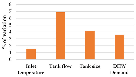 The results show that the variation of the outlet flow to the consumer has the highest impact on the electrical efficiency, of about 6.8%. The next highest impact factor is the size of the tank with a variation of 4.7%. The cold-water main temperature showed a variation of only 1.5%. Matching the profile of the consumer is also an important aspect, as it was observed that the peak electrical efficiency occurs during peak consumer demand. Finally, the instantaneous variation of the thermal and electrical power of the system was analysed as a function of the temperature at the inlet of the photovoltaic-thermal panel. The results of this analysis indicate that the net instantaneous power delivered to the tank increases at a rate of 12.14% with the increase of temperature of the PVT inlet fluid.