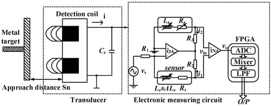 The primary transducer is actually made up of inductors and capacitors, which generate electromagnetic fields through the excitation oscillation current inside the sensor, thus forming an induction surface at the end face of the sensor [,]. When the approaching distance or motion information of the target metal object changes, the parameters of the primary side transducer will change, such as the quality factor and coil inductance. The electronic measurement circuit of the sensor outputs the corresponding control signal by detecting the change signal of oscillation circuit parameters. The control signal can be an analog quantity corresponding to the detection distance or it can be a switch signal.