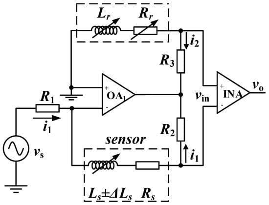 Due to the symmetry of the bridge arm, an AC bridge circuit is usually used as a detection circuit [,]. However, this method has limitations and will incur extra temperature drift [,]. Considering the common mode noise is effectively suppressed and the effective differential signal is retained in the differential circuit, the bridge circuit and differential detection circuit are combined in this paper, and the bridge differential inductance detection circuit is employed as shown in Figure 2.