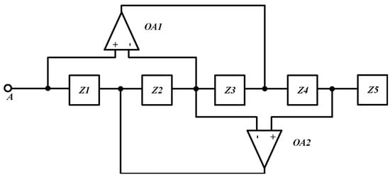 When the target metal object is not near the detection coil, the reference inductance value in the electronic measurement circuit should be equal to the detection coil inductance value, meaning that the output is zero. Otherwise, when the target metal is close to the induction head, the proximity distance cannot be reflected truly and the required measurement accuracy cannot be achieved. This requires that the reference inductance in the bridge differential detection circuit should be adjustable. In this paper, the equivalent inductance is realized by the general impedance converter shown in Figure 3 [,].