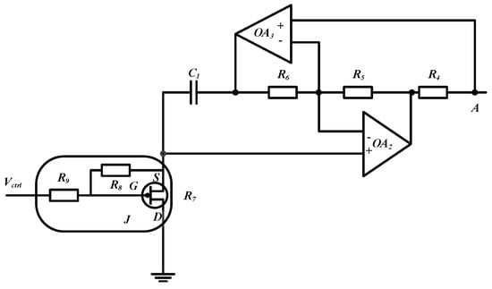 It can be seen from Figure 4 that the inductance value of reference inductance can be adjusted by changing the value of . In order to realize that the value of resistance can be adjusted by the electronic control signal, this paper uses the junction field-effector transistor (JFET) to realize . The JFET is a voltage-controlled device, which does not need excessive signal power. It has a low noise figure and a wide-ranging variable resistance area. In this way, the specific value of the voltage-controlled resistance can be achieved by controlling the gate voltage of the JFET, where . When and near the JFET are equal, the linearity of the JFET can be effectively increased. The variable resistance value of the JFET is only related to the gate voltage and is not affected by the drain source voltage .