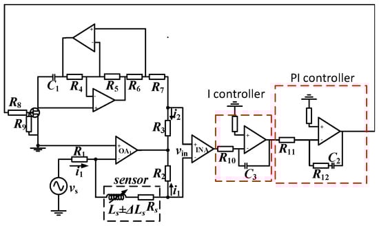 For long-distance measurement, a bridge differential inductance detection circuit is used in the measurement circuit of sensors in this paper []. The detection circuit detects the inductance variation of the coil in the induction surface to realize the measurement of the approach distance of the target metal objects. This method can eliminate most external interference signals and, as far as possible, ensure the effectiveness of the necessary information we need to enhance the anti-interference ability [,]. In order to achieve consistent product performance, in this paper, we propose an automatic zero calibration method for the foundation of an integral–proportional-integral (I-PI) controller on the basis of a bridge differential inductance detection circuit. Because the reference inductor in this paper needs to be adjustable, this method solves the problem of the difficulty of making the reference inductor [].
