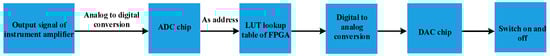 As can be seen from Figure 14, the signal amplified by the instrument is converted to an analog-to-digital signal through the ADC chip. The digital signal is sent into the FPGA, and the digital signal is used as the address of the look-up table of the FPGA to be searched through. Different target metal objects switch different look-up tables for their signal output in order to realize the output compensation of metals with different attenuation coefficients and the on–off switching of the inductive proximity sensor for different metals at the same detection distance.