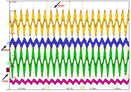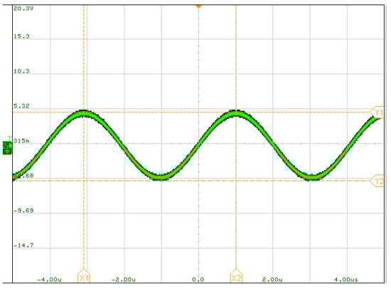 The experimental results verify the efficacy of the automatic zero adjustment technology and the inductive proximity sensor with an attenuation coefficient of 1. The FPGA chip is xc7a35tfgg484-2 from Xilinx. The ADC chip AD9280 and DAC chip AD9708 were created by the Analog Device Company. The instrument amplifier was INA101HP from Texas Instruments. The waveform of the voltage source is shown in Figure 15. The output voltage waveform after automatic zero adjustment by the I-PI controller is shown in Figure 16. The picture of the prototype is shown in Figure 17. We can see that the experimental waveforms coincide with the simulation waveforms, and the circuit achieves the function of zero adjustment.