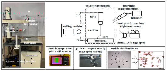 Figure 2 shows the semi-automated SMAW experimental apparatus, which was constructed by maintaining perpendicularity between the electrode and base metal constant (welding angle θ = 90°) and specifying the maximum feed rate of the welding torch as 7 mm/s. This made it possible to analyze the size and scattering velocity of the particles. As shown in the figure, welding spatters were scattered under different welding times (Δt) and electrical power (Pe), and the scattering velocity and mean temperature of the welding spatters were measured using a high-speed camera (model: phantom Miro M/R/LC310, USA) and a thermal imaging camera (model: Fluke Tix501). The scattering velocity and mean temperature of the welding spatter were measured using a high-speed camera (model: phantom LC310) and a thermal imaging camera (model: Fluke Tix501). The particle size distribution was determined using Image J software after collecting all welding spatter in a 50 × 46 × 64 cm3 acrylic box. Table 1 lists the specifications of the experimental apparatus and the experimental conditions for the average values of three times results are denoted in Table 2.