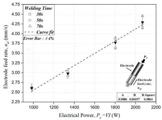 Figure 3 shows the variation of the measured reduction rate (urate) of the electrode length according to the electrical power (Pe) in the case of welding times (Δt) of 30 s, 50 s, and 70 s. It is seen that as Pe increased, urate also increased proportionally as the mass of the electrode welded to the base metal (Δmb,p) increased. When Pe was constant, a constant value of urate was calculated, which was consistent with that obtained using Equation (6) within ±4% for the average values urate regardless of Δt.