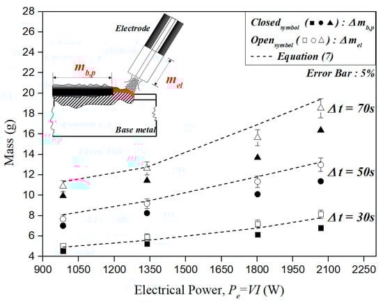 Figure 4 shows the variation in the measured mass loss of the electrode (Δmel) and the mass welded to the base metal (Δmb,p) according to the electrical power (Pe) for the welding times (Δt) of 30 s, 50 s, and 70 s. In this figure, the symbols enclosed in brackets represent Δmel, which increased proportionally to urate. When increased keeping Pe constant, Δmel increased in proportion to . Therefore, when Equation (6) and the electrode density measured using a load cell (ρ = 4726 kg/m3) are applied, Δmel is given by Equation (7) expressed by the dotted line, which agrees with the measured value within an error range of approximately ±5%.
