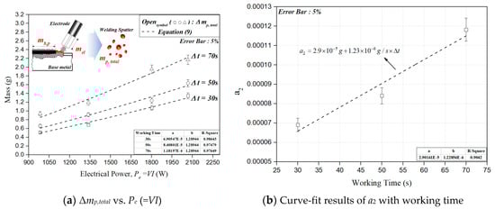 Figure 5a shows the variation of the total mass of the particles scattered from the electrode (Δmp,total) using Equation (1), mass reduction of the electrode (Δmel), and mass welded to the base metal (Δmb,p) for the welding times (Δt) of 30 s, 50 s, and 70 s according to the electrical power. The result of curve-fitting the calculated values of Δmp,total with increasing electrical power (Pe) under the same Δt values is shown in Equation (9).