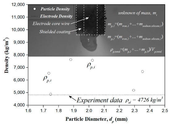 Figure 6 shows the density values (ρi) of a single scattered welding particle measured by calculating the mass (mp,i) and volume (ΔVp,i) of the particle using diameters (dp,i) of 1.736, 2.023, 2.294, and 2.352 mm. Because the electrode contains various metal components, as shown in Table 1, ρi may vary depending on the material composition inside the shield and core [,]. In particular, the mass proportions of metals that constitute each particle must be determined to obtain the total volume of scattered welding spatter (ΔVp,total), but limitations exist in analyzing the density when measuring each mixed component for at least 1000 small particles with a diameter of 0.1 mm or less. Therefore, we attempted to analyze the thermal characteristics of welding spatter by assuming ρp,total ≡ ρel (4726 kg/m3) and calculating ΔVp,total as shown in Equation (11).