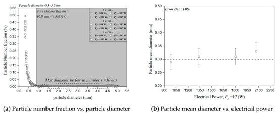 Hagimoto et al. [] calculated the particle size according to the electrode diameter when the same electrical power was supplied to the electrode and found that approximately 80% of the particles were scattered to a distance of 0.5 m, 15% to 0.5–1.0 m, and 5% to more than 1 m. They reported that fire can spread to combustibles (urethane foam etc.) when large particles of diameters 0.9–3.0 mm are scattered to a distance of more than 3.5 m.