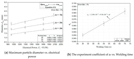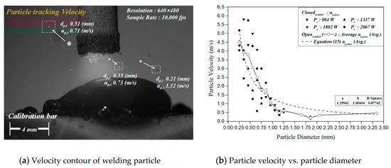 Figure 9a shows the results of measuring the mean particle velocity according to the particle diameter under an electrical power of 984 W using a high-speed camera (model: phantom LC310) and particle tracking velocimetry (PTV). It is observed that the scattering velocity showed a tendency to decrease as the particle diameter increased under the experimental conditions of the welding time (Δt) and electrical power (Pe), as shown in Table 2. The correlation between the maximum diameter of scattered particles (dp,max) and the scattering velocity (up,max) was analyzed, as shown in Figure 9b. up,max decreased as dp,max increased with a difference of less than ±10% depending on the values of Δt and Pe, and the relationship shown in Equation (15) was found.