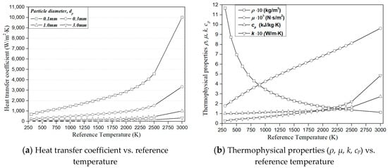 where Red,max is the Reynolds number (Red,max = ρpup,maxdp,max/μ) considering the maximum particle diameter (dp,max). In particular, the thermal conductivity (k), specific heat (Cp), viscosity (μ), and density (ρ) of air vary depending on the reference temperature (Tref = (Tp,s + T∞)/2), as shown in Figure 10a. In this study, these can be calculated using Equations (17)–(20) based on the data given by this study [].