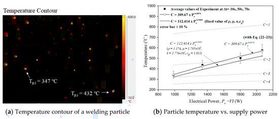 where Vp,total, dp,m, , , Re, and Pr are the total volume of particles, mean diameter of particles, Nusselt number, thermal conductivity, Reynolds number (ReD = ρup,mdp,m/μ), and Prandtl number (Pr = Cpμ/k)), respectively. Therefore, the temperature distribution prediction shown in Equation (2) is possible when Vp,total, dp,m, and up,m can be calculated using Equations (3) and (4). As the total volume, mean diameter, and scattering velocity of particles vary according to the welding time and electrical power, the functional relationship given by Equation (5) must be also determined [,].