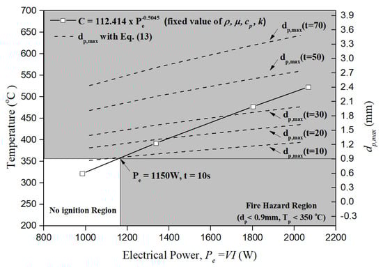 Figure 12 shows the results of calculating the maximum temperature and diameter of the welding particles when the welding time (Δt) ranged from 30–70 s and Pe from 984–2067.5 W. “Fire hazard region” means the possibility of fire spreading to combustible materials such as polyurethan foam as mentioned in Ref [,,], and “No ignition region” means the minimized conditions of fire spread. Based on previous studies, it can be confirmed that the maximum welding time and electrical power are 10 s and 1150 W, respectively, when the minimum particle size of welding spatter for the risk of fire spread is 0.9 mm, and the minimum temperature is 350 °C []. Therefore, the results of this study indicate that it is possible to calculate the electrical power for minimizing the risk of fire due to welding spatter when the electrode type and welding time are known.