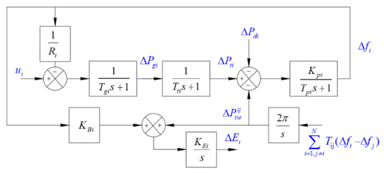 The proposed control law of LFC is designed for interconnected multi-area power network, which is presented in Figure 1 [26,27,28,29,30]: