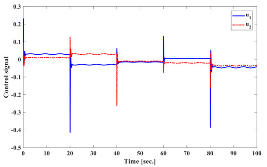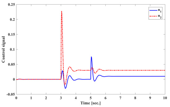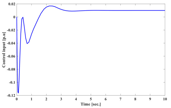 In the second case, the system responses in the frequencies of generator and the changes of tie-line power to the load demand are considered to apply for the new approach. The results are shown in Figure 12 for frequency deviation, Figure 13 for tie-line power deviation, and Figure 14 for control input signal. Figure 12 presents the frequency deviate of generators to point out that the proposed second order approach helps the power system reach to ordinary value about 5–6 s after load disturbances happen in the system. The scheduled value of tie-line power deviation is indicated in Figure 13. The comparative results between the suggested SOISMC approach and the previous method given in [26] show that the proposed method in Table 3 achieves a good transient response, such as smaller transient deviation and shorter settling time in terms of load disturbances.