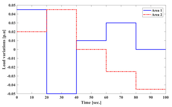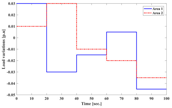 Variation load [p.u.] of areas 1 and 2 of the power system.