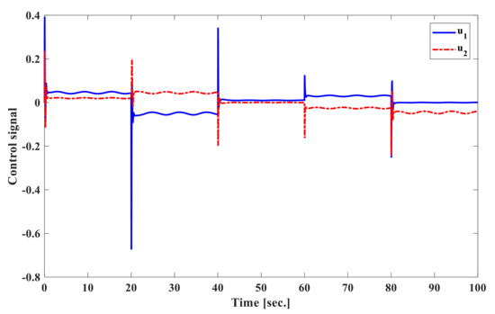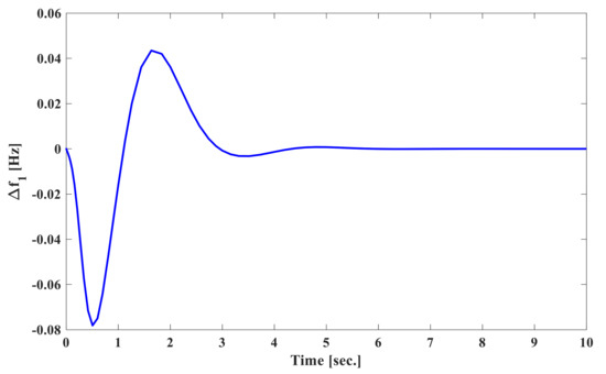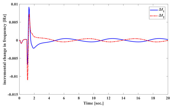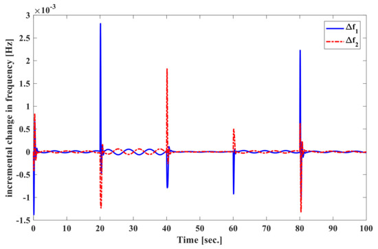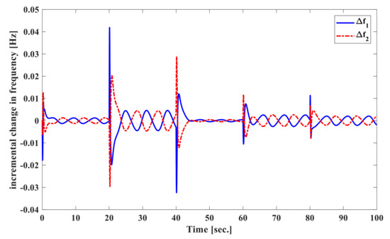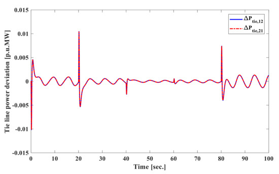 At first, we assume that the system parameters are at nominal values. The load disturbances acting on the system are p.u. at s in area 1 and p.u. at s in area 2 of power system. The frequency deviation of both area 1 and area 2 , tie-line power deviation , and the control input of area 1 and area 2 are shown in Figure 2, Figure 3 and Figure 4. Additionally, the settling time for the frequency deviation to converge to zero is about 3 s, which shows rapid response time to clear the disturbance as compared to 20–25 s response time given in [10]. It is easy to say that the proposed SOISMC creates a good dynamic response. Above all, the second-order law is used by the proposed controller to reduce overshoot and oscillation as well as the re-equipment of the system responses. The simulation results of Figure 2, Figure 3 and Figure 4 demonstrate the superiority of removing the chattering problem in finite frequency and verifying the usefulness of the proposed second-order integral sliding mode control law.