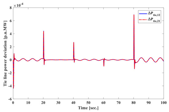 Tie line power deviation [p.u.MW] with matched disturbances.