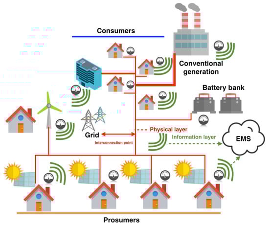 The interconnection of existing stand-alone solar home systems can form micro grids [4]. This tiny grid is formed by prosumers (households capable of producing and consuming electrical power, Figure 1) and consumers (households only consuming power). In this new architecture of distributed PV generation, many authors propose that consumers and prosumers can even trade self-produced energy on a micro grid energy market. This involves an information layer that feeds data to an energy management system (EMS) as it is shown in Figure 1. The EMS acts as the middleman between the physical and the information layer. The EMS needs to have accurate prediction photo voltaic power (PVP) models, consumption prediction models, an energy market model and other tools which are essential in a smart energy management system for increasing reliability, sustainability, efficiency and flexibility [7,8,9,10].
