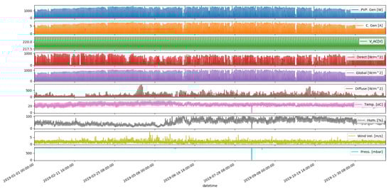 The electric variables measured from the PVSS after the inverter are the following: active power generated [W], average phase current generated [A] and the AC Voltage generated [V]. The variables available by the ESOLMET are: direct radiation [W/m2], global radiation [W/m2], diffuse radiation [W/m2], temperature [°C], humidity [%], wind speed [m/s] and barometric pressure [mBar]. All these ten variables will conform our dataset, and are shown in Figure 4.