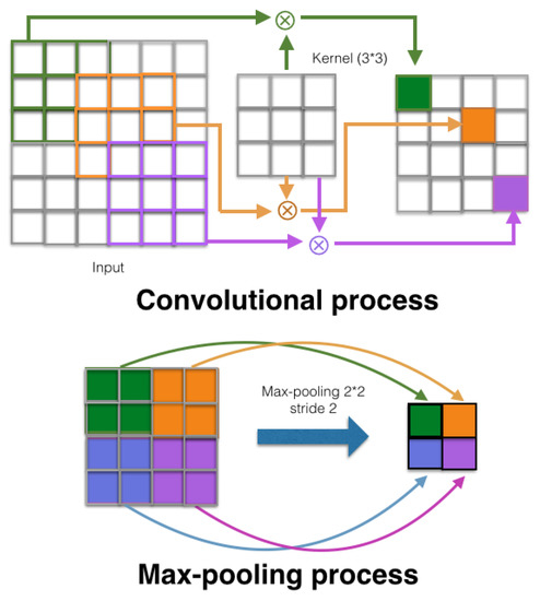 CNN are very popular for extracting local features in images, for example. Convolution is the main concept of a CNN. Our proposed CNN includes two parts: the convolutional layers (Equations (1) and (2)) and the pooling layer (the main purpose of this layer is to reduce the number of parameters of the tensor by reducing its size Figure 6) which helps to reduce computation time.