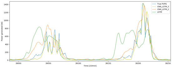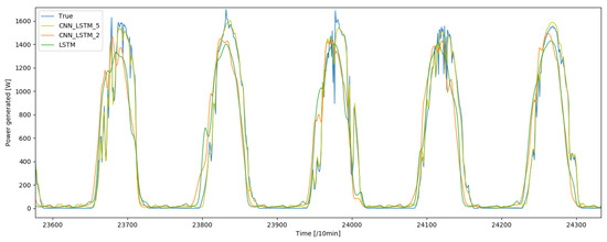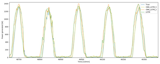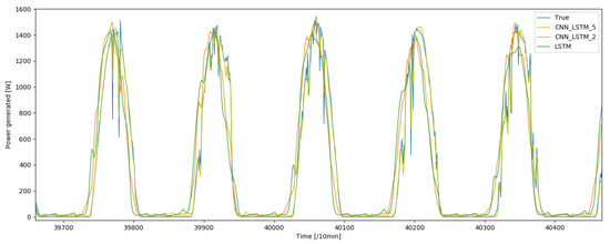 A part of the dataset was used to train the model (80 %) and another part was used to verify the predictions (20 %). Figure 9, Figure 10 and Figure 11 show the graphs of the PV power prediction during summer, fall and winter respectively. On the X axis, we have time with a 10-min time resolution and on the Y axis, power in [W]. The blue curve are the actual measurements and the yellow curve is the prediction of the five-layer hybrid model, the orange curve corresponds to the two-layer model and the green curve is a five-layer LSTM model.