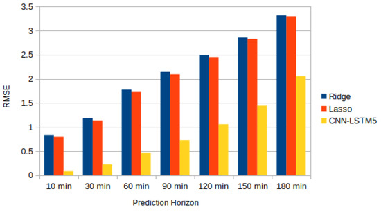 Furthermore, we compare competitive benchmarks with the proposed model, the results are shown in Table 4. The forecasting horizons range from 10-min ahead to 180-min ahead. As it is expected, when the horizon prediction increases the RMSE also does it in a linear way (Figure 13).