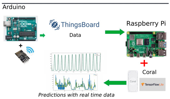 The proposed model will be integrated in a Raspberry Pi 3 with a Coral TPU accelerator to have a real time data prediction system. The general scheme is shown in Figure 14. The ESP32 sends measurements to an IoT server (Thingsboard). This real time data is also available for the Raspberry Pi to calculate new weights and update the hybrid model. The Coral TPU will provide the Raspberry Pi the capability to run machine learning models. This kind of low cost system will be possible to use in multiple prosumers in a micro-grid environment.